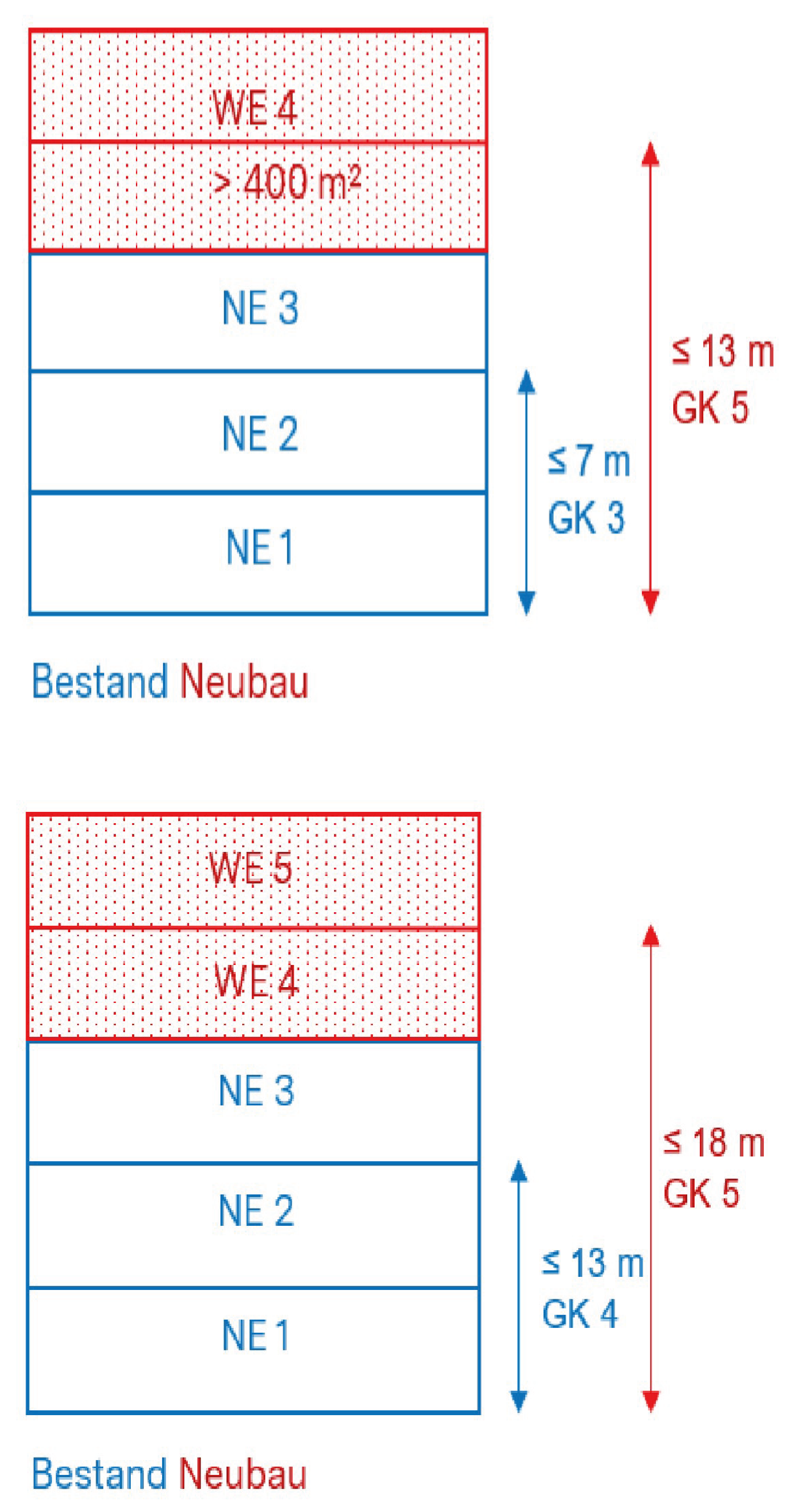 § 27f Abs. 2 behandelt Aufstockungen und Dachgeschossausbauten jeweils zu Wohnzwecken, die zu einer neuen Einstufung des Gebäudes in Gebäudeklasse 4 führen. Unter der Voraussetzung, dass die Bedingungen von Nr. 1 bis 4 des § 27f Abs. 2 erfüllt sind, genügt der Nachweis, dass die Anforderungen an den Feuerwiderstand der tragenden und aussteifenden sowie raumabschließenden Bauteile der bestehenden Gebäudeteile die Anforderungen der Gebäudeklasse 3 erfüllen. Der Neubau hat die Anforderungen der Gebäudeklasse 4 zu erfüllen, sofern es sich nicht um eine Aufstockung um nur ein Geschoss handelt. Sind die genannten Voraussetzungen nicht erfüllt bzw. im Zuge der Sanierung nicht erfüllbar, ist die Erleichterung nach § 27f Abs. 2 nicht anwendbar.